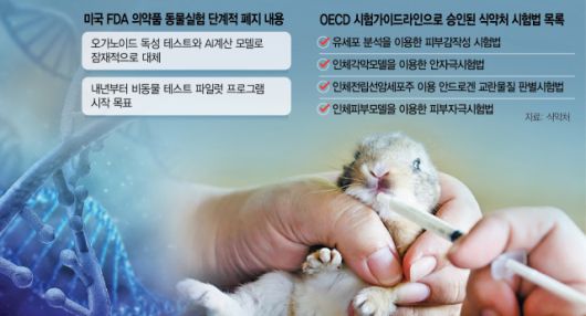 미국 식품의약국(FDA)이 의약품 개발 과정에서 동물실험을 단계적으로 폐지하겠다고 선언했지만 국내 산업계는 사실상 무방비 상태다. 관련 법률은 현재 국회에 계류 중으로 통과될 기미가 보이지 않는 상황에서 담당 부처인 식품의약품안전처가 가이드라인을 마련 중이지만 법적 근거가 미비해 산업 육성에는 한계가 있다는 지적이 나온다.