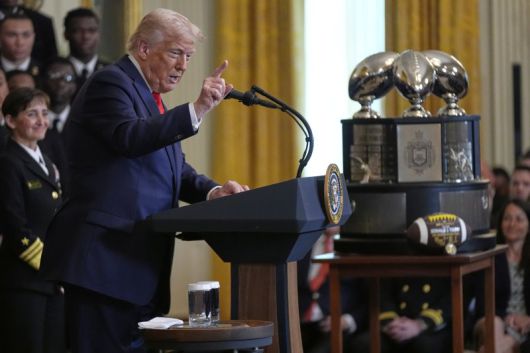 뉴욕 증시가 도널드 트럼프(가운데) 미국 대통령의 오락가락하는 관세정책에 대한 불안감 속에 15일(현지시간) 거래일 기준으로 사흘 만에 하락세로 방향을 틀었다. 이날 M7 빅테크 가운데 테슬라와 엔비디아만 상승했다. AP 뉴시스 |