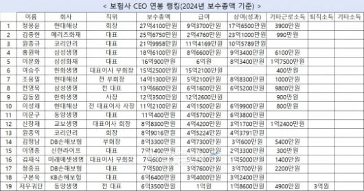 보험사 대표이사, 부회장, 회장 중에서 보수총액 상위권은 보험사 오너인 정몽윤 현대해상 회장이 1위를, 2위는 원종규 코리안리 대표가 차지했다.