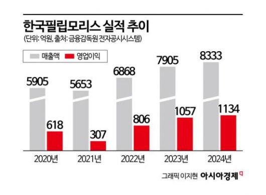 16일 금융감독원 전자공시시스템에 따르면 지난해 한국필립모리스의 매출액은 8333억원으로 전년(7905억원) 대비 5.4% 늘어난 것으로 집계됐다. 수익성 개선 흐름도 이어갔다. 같은 기간 영업이익은 1134억원으로 1년전(1057억원)보다 7.3% 증가하며 2년 연속 1000억원을 넘어섰다.