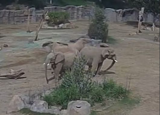 다 자란 성체 코끼리인 은둘라, 음웅가니, 코시는 일곱 살 새끼 코끼리 줄리와 므카야를 중심에 두고 주변을 둘러쌌고, 귀를 활짝 펴고 바깥을 경계하며 수 분간 움직이지 않았다. 샌디에이고 동물원 X(엑스) |