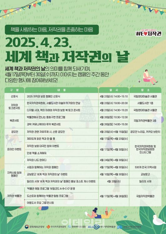 [이데일리 장병호 기자] 문화체육관광부(문체부)는 한국저작권위원회, 한국저작권보호원과 ‘세계 책과 저작권의 날’을 맞이해 17일부터 30일까지 ‘저작권 보호 캠페인’을 진행한다.