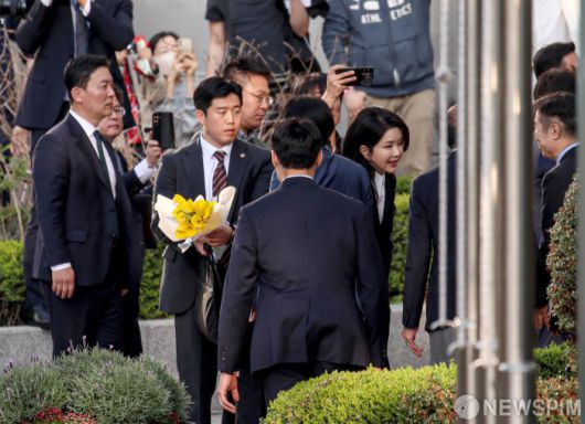 [서울=뉴스핌] 정일구 기자 = 김성훈 경호차장이 11일 오후 서울 서초구 아크로비스타 정문에서 김건희 여사를 경호하고 있다. 2025.04.11 mironj19@newspim.com |
