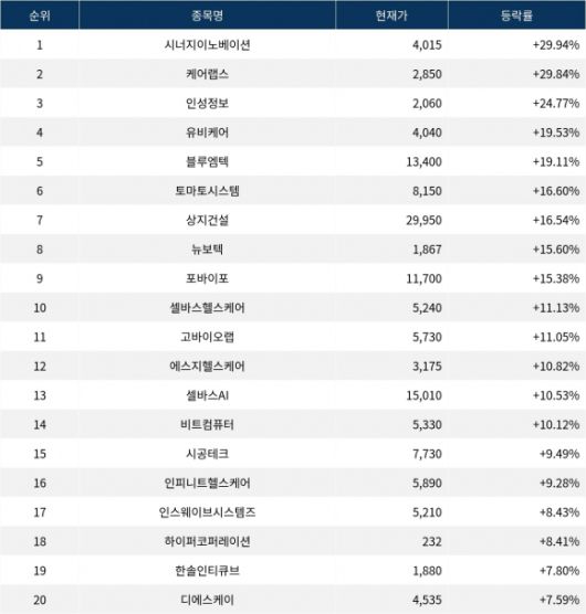 6위 토마토시스템(393210)은 현재가 8,150원으로 16.60% 상승 중이다. 7위 상지건설(042940)은 현재가 29,950원으로 16.54% 상승 중이다. 8위 뉴보텍(060260)은 현재가 1,867원으로 15.60% 상승 중이다. 9위 포바이포(389140)는 현재가 11,700원으로 15.38% 상승 중이다. 10위 셀바스헬스케어(208370)는 현재가 5,240원으로 11.13% 상승 중이다.