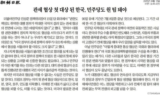 조선 = 관세 협상 첫 대상 된 한국, 민주당도 원 팀 돼야