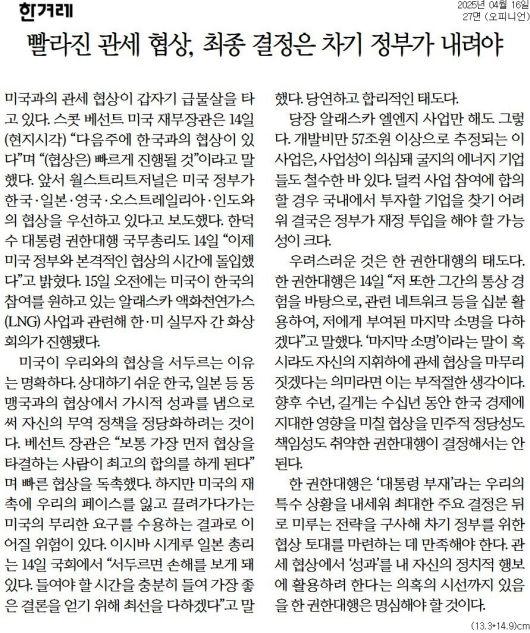 한겨레 = 빨라진 관세 협상, 최종 결정은 차기 정부가 내려야