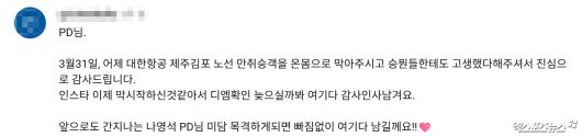 글쓴이는 "PD님. 3월 31일 어제 대한항공 제주-김포 노선 만취 승객을 온몸으로 막아주시고 승무원들한테도 고생했다 해주셔서 진심으로 감사드립니다. 인스타 이제 막 시작하신 것 같아서 DM 확인 늦으실까 봐 여기다 감사 인사 남겨요"라며 "앞으로도 나영석 PD님 미담 목격하게 되면 빠짐없이 여기다 남길게요"라며 감사 인사를 전했다.