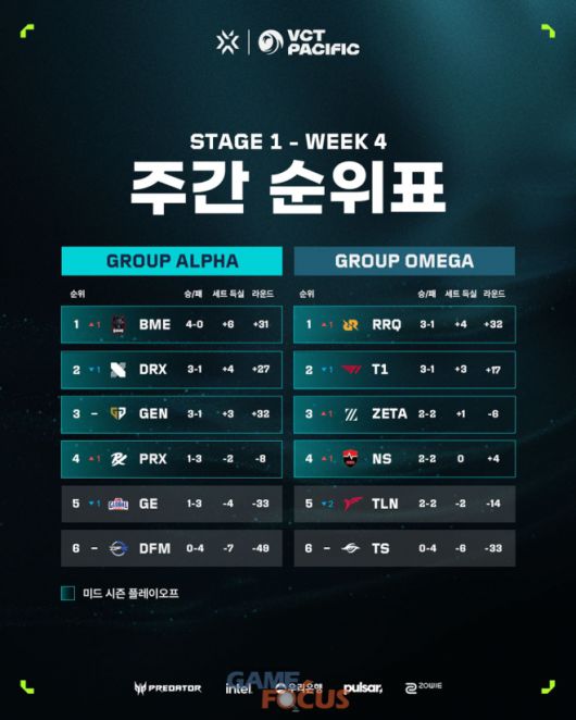 5대5 대전형 캐릭터 기반 전술 슈팅 게임 '발로란트'의 개발 및 유통사인 라이엇 게임즈(한국 대표 조혁진)는 지난 12일(토)부터 14일(월)까지 서울 마포구 상암동에 위치한 상암 SOOP 콜로세움에서 열린 VCT 퍼시픽 스테이지 1 4주 차에서 알파 그룹에 속한 DRX와 오메가 그룹의 T1이 첫 패배를 당하면서 연승 행진에 제동이 걸렸다고 밝혔다. 각 그룹에서 1위 자리를 놓고 경쟁하던 팀들에게 패하면서 DRX는 알파 그룹 1위 확률이 사라졌고 T1은 자력으로 1위에 오를 가능성이 크게 줄어들었다.