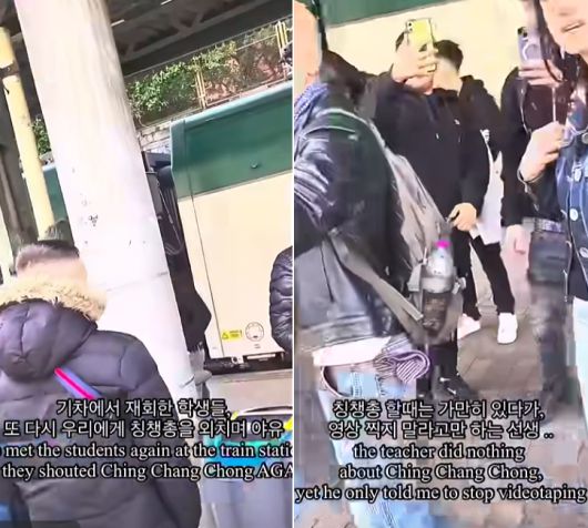상황이 일단락되는 줄 알았으나, 기차역에서 A씨 부부를 다시 만난 학생들은 재차 “칭챙총”이라고 외쳤다. 위협을 느낀 A씨는 인종차별의 심각성을 인지하고 영상 촬영을 시작했는데, 영상에는 학생들이 큰 소리로 야유하는 모습이 담겼다. 뿐만 아니라 학생들을 인솔하는 교사가 A씨 촬영을 저지하기도 했다.