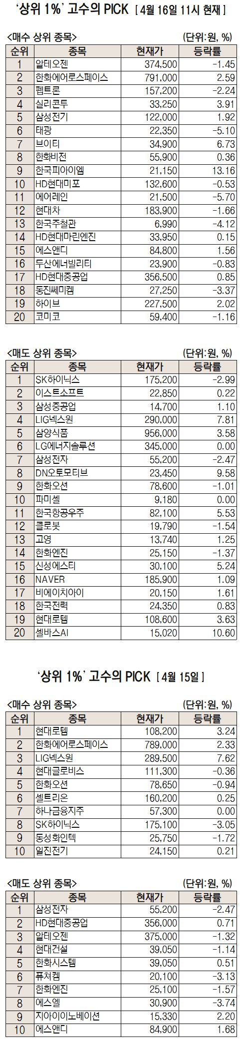 미래에셋증권에서 거래하는 고수익 투자자들이 16일 오전 가장 많이 순매수한 종목은 알테오젠(196170), 한화에어로스페이스(012450), 펩트론(087010), 실리콘투(257720)인 것으로 집계됐다.