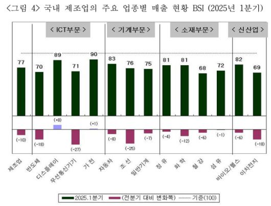 업종별 매출 현황 BSI를 보면 ▲ICT(75) ▲신산업(77) ▲일반기계(79) ▲소재 부문(77) 등 대부분에서 전분기보다 하락했다. 특히 ICT와 신산업은 3분기 연속 내리막을 기록했다.