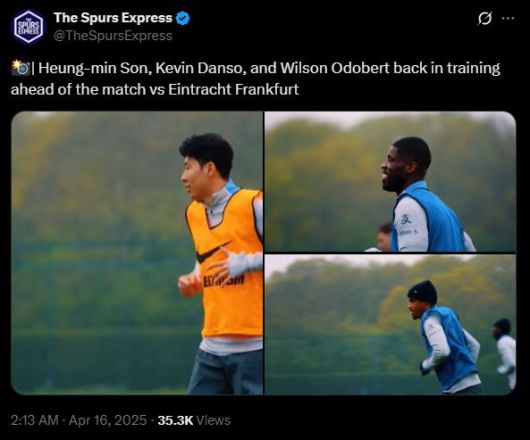 토트넘 전문 매체 '더 스퍼스 익스프레스'는 16일(한국시간) 자신의 사회관계망서비스(SNS)를 통해 "손흥민이 케빈 단소, 윌송 오도베르와 함께 훈련에 복귀했다"고 보도했다. 이들은 프랑크푸르트전을 앞두고 팀 훈련에 참여했으며, 출전 가능성이 높아진 셈이다.