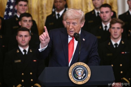 도널드 트럼프 미국 대통령이 15일(현지시간) 워싱턴 백악관에서 해군 사관학교 축구팀에게 총사령관 트로피 수여식서 연설을 하고 있다./AFPBBNews=뉴스1 |