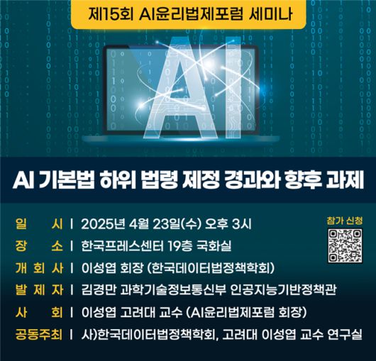 포럼 회장인 이성엽 고려대 교수는“정부가 최근 AI 기본법 하위 법령 초안을 마련하 고 의견 수렴을 시작한 상황에서 학계 전문가를 대상으로 하는 첫 번째 세미나라는 점에서 의미가 있다"며 "보다 합리적이고 실행 가능한 AI 규제가 될 수 있도록 다양한 의견이 개진될 것"이라고 말했다.