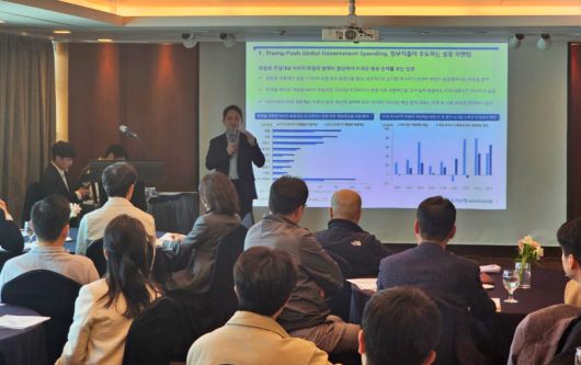 민경원 우리은행 선임연구원이 지난 15일 ‘2025년 2분기 환율전망 세미나’에서 부산지역 수출입기업 임직원에게 환율 전망에 대해 강연하고 있다. [우리은행 제공] |