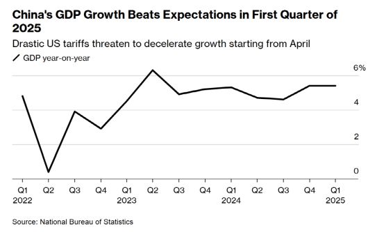 중국의 올해 1분기 국내총생산(GDP) 성장률이 5.4%로 시장 예상치를 웃돌았다. 다만 도널드 트럼프 미국 행정부의 대규모 관세 부과로 전망은 빠르게 악화하고 있다.