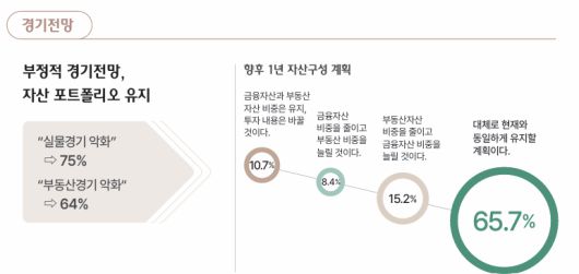 경기 전망이 어두운 만큼 자산 포트폴리오 조정에도 소극적이었다. 부자 10명 중 6명(65.7%)이 자산구성을 대체로 현재와 동일하게 유지하겠다고 했다. 조정 의향이 있는 경우 부동산보다는 금융자산 비중을 늘리겠다는 부자가 많았다.