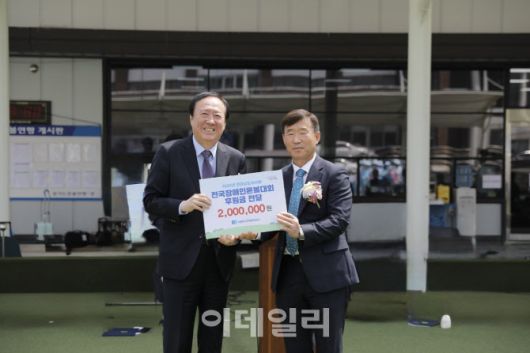 16일 한민규 사학연금 상임감사(왼쪽)와 공승근 전라남도장애인론볼연맹 회장이 기념촬영을 하고 있다. (사진=사학연금) |