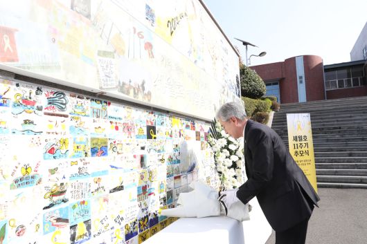 경남도교육청은 세월호 참사 11주기인 16일 도교육청 교육연수원에 설치된 ‘세월호 기억의 벽’에서 추모식을 엄수했다.