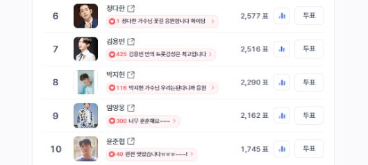 4월 3주차 '트로트에 빠지게 만든 그 남자! 내 마음까지 훔친 1위 남자는?' 일간 투표에서 정다한은 2,577표를 획득해 6위에 올랐다. 16일 오후 3시 33분 기준으로 집계된 이 결과는 10년간 변함없는 무대와 진정성 있는 음악 활동에 팬들이 보내는 신뢰와 응원의 표현이다.