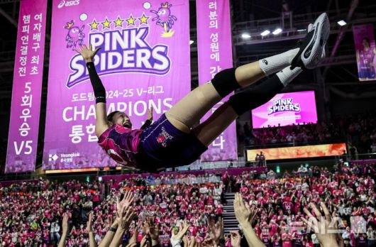 [인천=뉴시스] 정병혁 기자 = 지난 8일 인천 부평구 삼산월드체육관에서 열린 2024-2025 V-리그 여자부 챔피언결정전(5전 3선승제) 5차전 흥국생명 핑크스파이더스와 정관장 레드스파크스의 경기에서 승리해 통합 우승을 차지한 흥국생명 김연경이 동료들로 부터 헹가래를 받고 있다. 2025.04.08. jhope@newsis.com |