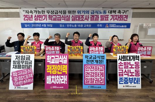 민주노총 전국학교비정규직노조가 16일 서울 중구 민주노총 회의실에서 기자회견을 열고 2025년 상반기 학교 급식실 실태조사 결과를 발표하고 있다. 학비노조 제공 |