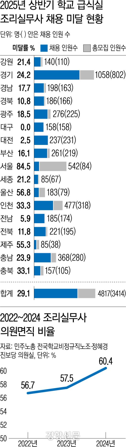 민주노총 전국학교비정규직노조는 16일 서울 중구 민주노총 회의실에서 기자회견을 열고 2025년 상반기 학교 급식실 실태조사 결과를 발표했다. 지난달 4일 기준 전국 17개 시·도교육청의 조리실무사 채용 미달률 평균은 29.1%로 집계됐다. 대구를 제외한 모든 시·도교육청에서 모집 인원보다 채용 인원 수가 적었다. 서울(84.5%), 울산(56.8%), 제주(55.3%), 인천(33.3%), 충북(33.1%)은 전국 평균보다 미달률이 높았다.