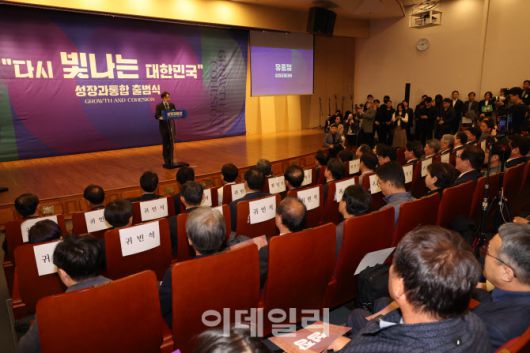 유종일 성장과통합 상임공동대표가 16일 오전 서울 여의도 국회 도서관 대강당에서 열린 성장과통합 출범식에서 개회사를 하고 있다.(사진=뉴시스) |