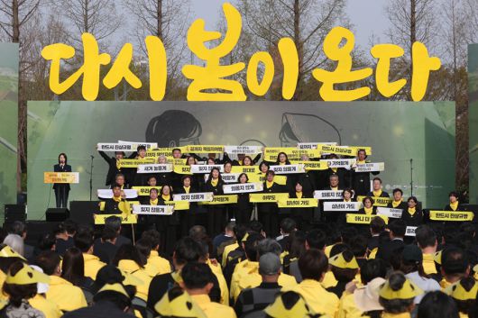 참사 11주기를 맞은 16일 각지에서 희생자들을 기리는 추모 행사가 열린 가운데, 4.16 재단은 안산시 단원구 화랑유원지에서 ‘세월호 참사 11주기 기억식’을 개최했다.