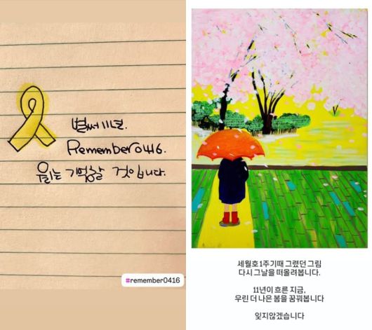 신소율은 "벌써 11년. Rememver0416. 우리는 기억할 것입니다"라는 메모와 함께 노란 리본을 그려넣은 사진을 게재했다. 솔비는 "세월호 1주기 때 그렸던 그림"이라며 그림 사진을 게재하고 "다시 그날을 떠올려봅니다. 11년이 흐른 지금. 우린 더 나은 봄을 꿈꿔봅니다. 잊지 않겠습니다"라고 했다.