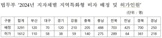 법무부의 ‘2024년 지자체별 지역특화형 비자 배정 및 허가인원’을 보면 부산, 대구, 경기, 강원, 충북, 충남, 전북, 전남, 경북, 경남 등 10개 광역 지자체에 지역특화형 우수인재 비자 배정인원은 3291명이다. 이 중 실제로 비자를 취득한 외국인은 총 1612명으로, 목표로 한 배정인원의 절반 수준이다.