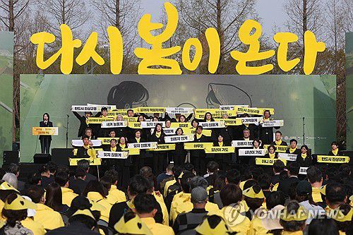 '다시 봄이 온다'는 노란색 큰 글씨가 설치된 무대 앞에는 희생자 가족과 시민 등이 의자에 앉아 희생자들을 떠올리며 슬픔에 잠겼다.