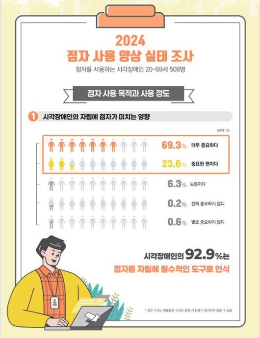 조사 결과 92.9%가 점자를 자립에 중요한 요소로 인식하는 것으로 나타났다. '매우 중요하다'고 응답한 비율은 69.3%, '중요하다'고 응답한 비율은 23.6%였다.