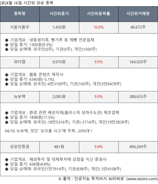[서울=뉴스핌] 로보뉴스 = 4월 16일, 인공지능 투자비서 ‘AI라씨로’는 시간외 단일가 매매에서 주가가 크게 변동한 서울식품우(004415), 와이랩(432430) 등의 최근 동향을 분석해서 발표했다.