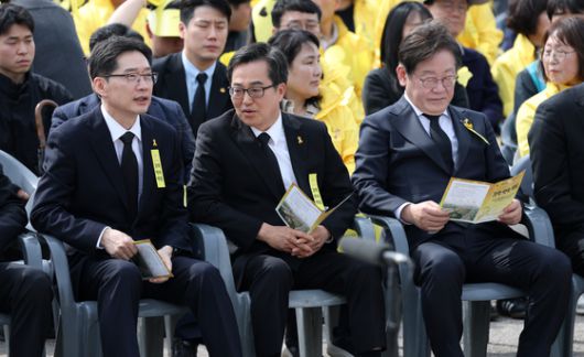 세월호 참사 11주기를 맞은 16일 안산시 단원구 화랑유원지에서 열린 '세월호 참사 11주기 기억식'에 더불어민주당 이재명 전 대표(오른쪽부터), 김동연 경기지사, 김경수 전 경남지사가 참석해 있다. 연합뉴스 |