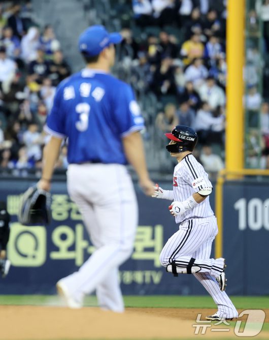 (서울=뉴스1) 이승배 기자 = 16일 서울 송파구 잠실야구장에서 열린 프로야구 '2025 신한 SOL 뱅크 KBO리그' 삼성 라이온즈와 LG 트윈스의 경기, 2회말 LG 공격 2사 주자 1루 상황 박동원이 투런포을 치고 베이스를 돌고 있다. 2025.4.16/뉴스1