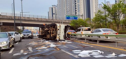 경찰은 음주 상태로 차를 몰던 40대 운전자가 내리막 도로에서 우회전하는 과정에서 트럭이 넘어진 것으로 보고 사고 경위를 조사하고 있다.