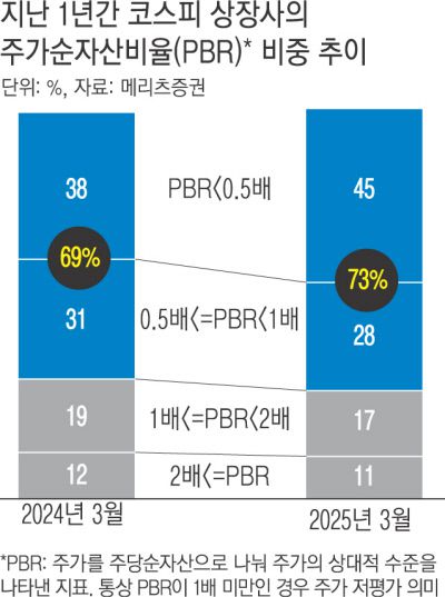 메리츠증권에 따르면 밸류업프로그램이 추진되기 시작한 지난해 3월 전체 코스피 상장사의 69%가 PBR 1배를 밑돌았지만, 지난달에는 73%로 오히려 비중이 늘어났다. 메리츠증권 투자전략팀은 보고서에서 “구조적 저평가의 핵심에는 낮은 PBR, 불투명한 지배구조, 단발성에 그치는 주주환원 정책이 자리잡고 있다”며 “지배구조 개혁 없는 단기 정책만으로는 코리아디스카운트를 해소하기 어렵다”고 짚었다.