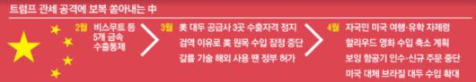홍콩 사우스차이나모닝포스트(SCMP) 보도 등을 종합하면 미국의 대중 핵심 수출 품목인 대두의 3월 중국 수입액은 전년 동월 대비 36.8% 줄었다. 이를 두고 현지 매체들은 중국 정부가 트럼프 행정부의 전방위적인 관세 공격을 예상하고 자국 수입업체들에 미국산 대두 구매 중단 지시를 내렸을 가능성이 크다고 분석했다.