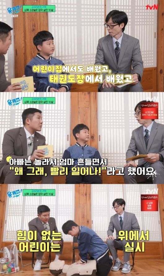 16일 밤 방송된 tvN 예능 ‘유 퀴즈 온 더 블럭’에는 초등학교 3학년 정태운 군이 출연해 어머니의 생명을 구했던 사연을 밝혔다. 태운 군은 집에서 갑작스럽게 벌어진 긴박한 상황을 회상하며 “주방에서 ‘쿵’ 소리가 나서 가봤더니 엄마가 거품을 물고 쓰러져 있었어요”라고 당시 상황을 설명했다.