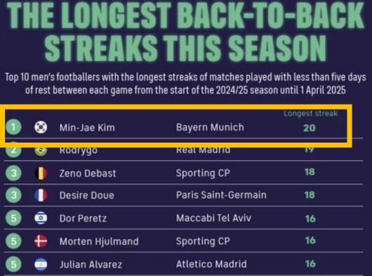 FIFPro에 따르면 김민재는 이번 시즌 전세계 프로 선수들 중 '5일 이내 간격으로 벌어진 경기를 소화한 회수' 1위다.