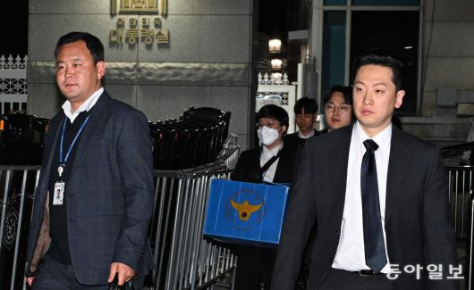 압수수색 못하고 철수하는 경찰 16일 오후 경찰청 국가수사본부 특별수사단 관계자들이 서울 용산구 대통령실 압수수색에 실패한 뒤 철수하고 있다. 경찰은 이날 오전 10시 13분경부터 윤석열 전 대통령과 김성훈 대통령경호처 차장의 특수공무집행방해 혐의와 관련해 비화폰 서버 등을 압수수색하려 했으나 대통령실, 경호처와 10시간 넘는 대치 끝에 오후 8시 37분경 철수했다. 송은석 기자 silverstone@donga.com |