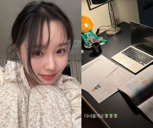 이어 이솔이는 "집안일 언제 끝나는지 아시는 분?"이라는 질문과 함께 귀여운 슬리퍼를 신고 있는 모습을 사진에 담았다. 그러나 결국 집안일을 마친 듯 그는 노트북과 책이 자리하고 있는 책상 사진과 함께 "다녀올게요"라고 덧붙였다.