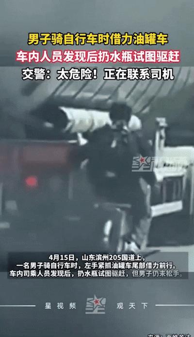 15일(현지 시각) 중국 넷이즈에 따르면 한 남성이 도로에서 유조차를 잡고 자전거를 타는 모습이 담긴 영상이 공개됐다.