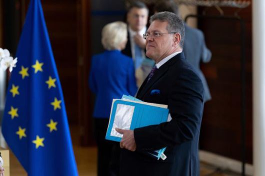 마로시 세프초비치 유럽연합(EU) 무역 담당 집행위원이 지난 9일 벨기에 브뤼셀의 EU 본부에서 열린 주간 정례회의에 참석하고 있다. 브뤼셀=AP 연합뉴스 |
