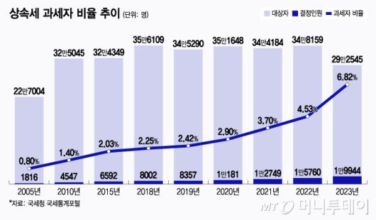실제 2005년만 해도 0.8%에 머물렀던 상속세 과세비율은 2023년 6.82%까지 상승했다. 특히 집값이 폭등한 서울의 경우 상속세 과세비율이 2023년 기준 15%까지 올랐다. 서울만 놓고 봤을 때 7명 중 1명 이상은 상속세를 내야한다는 의미다.