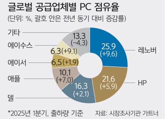 삼성전자, LG전자 등 국내 PC 제조사들에겐 새로운 기회다. 양사는 국내에선 1, 2위를 다투고 있지만 글로벌 PC 시장에선 1%대의 점유율로 존재감이 미미한 상황이다. 가트너에 따르면 올해 1분기 제조사별 전 세계 PC 시장 점유율은 레노버(25.9%), HP(21.6%), 델(16.3%), 애플(10.1%) 순으로 ‘2강 2중’ 구도를 형성했다. 2024년 1분기 대비 출하량 증감률을 살펴보면 레노버, HP 등 1∼6위 업체들의 출하량은 늘어난 반면 삼성·LG 등 나머지 업체가 속한 기타 부문은 4.3% 감소했다.