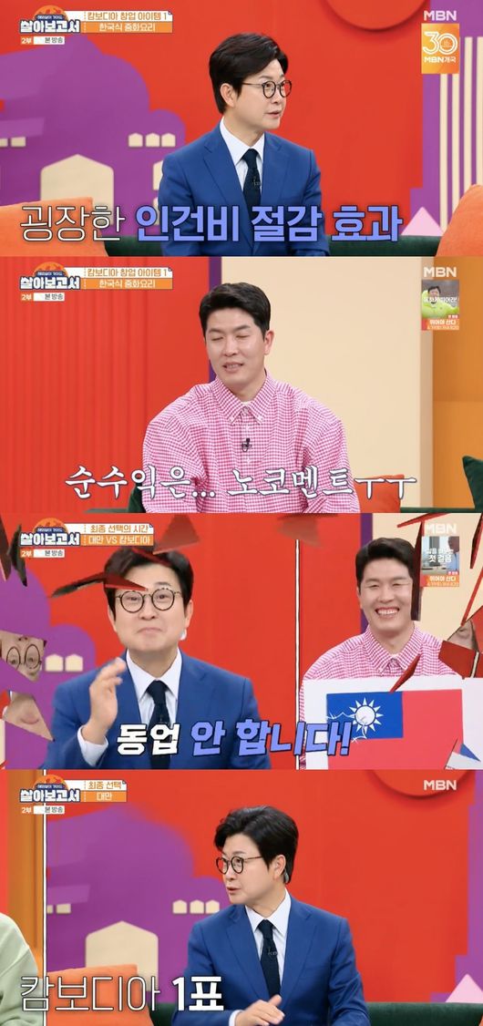 두 번째 해외 사업 후보지 ‘캄보디아’였다. 캄보디아는 K-푸드가 자리 잡을 정도로 한류 열풍이 불고 있었다. 가격 역시 한국과 비슷하게 측정되고 있어 패널들을 놀라게 했다. 뿐만 아니라 캄보디아는 창업 자금은 가격대가 있지만, 인건비는 저렴한 큰 장점이 있었다. 김성주는 “그러면 경쟁력있네. 사업할 때 인건비 무시 못하지 않냐”라고 했고, 김병현은 “인건비가 보통 30% 들어간다”라고 답했다.
