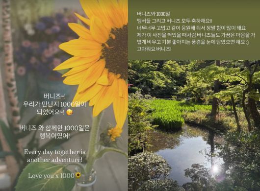 네 번째 멤버는 "버니즈와 1000일, 멤버들 그리고 버니즈 모두 축하해요! 너무너무 고맙고 같이 응원해줘서 정말 힘이 많이 된다. 버니즈들도 가끔은 마음을 가볍게 비우고 기분 좋아지는 풍경을 눈에 담았으면 한다. 고마워요!", 자정 직전 나타난 마지막 멤버는 "버니즈 안녕하세요. 벌써 1000일이 되었다는 게 믿기지 않지만 1000일이 되었어요. 우리들을 소중하게 생각해주는 사람들이 이렇게나 많다는 게 아직도 잘 믿기지 않고 신기하지만 항상 감사한 것 같아요. 그리고 저희 다섯 명을 조건 없이 진심으로 아껴주는 사람들과 함께 다양한 순간들을 함께하고 나이가 들어간다는 게 너무 소중하고 참 고마워요"라고 전했다.