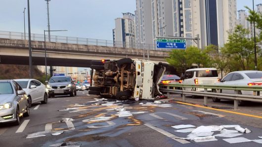 어제(16일) 오후 5시 58분 울산시 중구 종가로 유곡교차로 인근 지점에서 5t 트럭이 옆으로 넘어지면서 트럭 연료통이 파손돼 경유 수십 리터(L)가 주변 도로에 유출됐습니다.